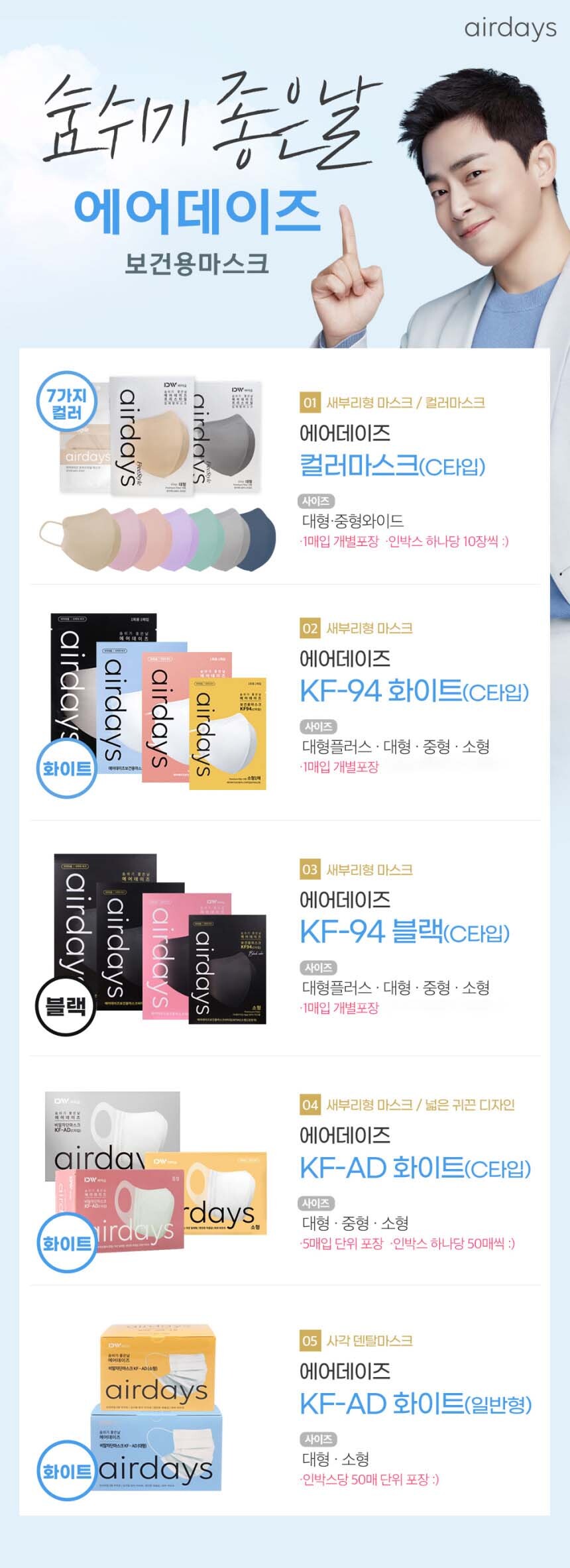 [에어데이즈] 보건용 비말차단 프리스타일 마스크 KF94 KF-AD 대형 중형 소형 화이트 블랙 10매 50매
