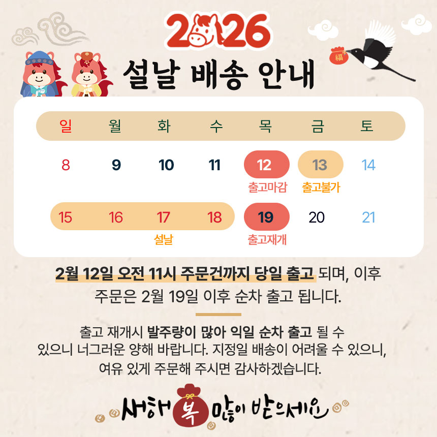 • 주문완료 후 재고 부족 등으로 인해 주문 취소 처리가 될 수도 있는 점 양해 부탁드립니다.