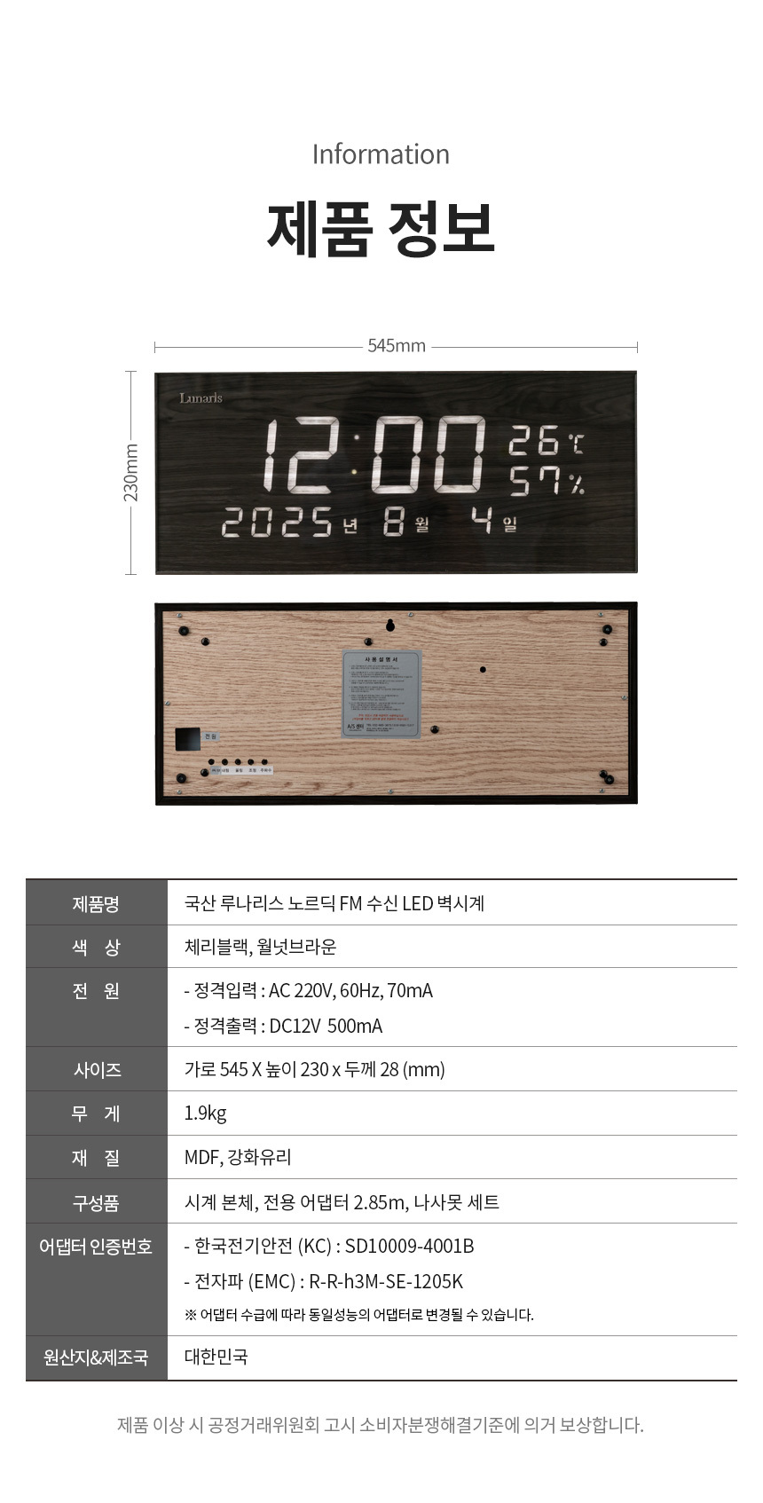 • 국산 루나리스 노르딕 FM 수신 LED 벽시계