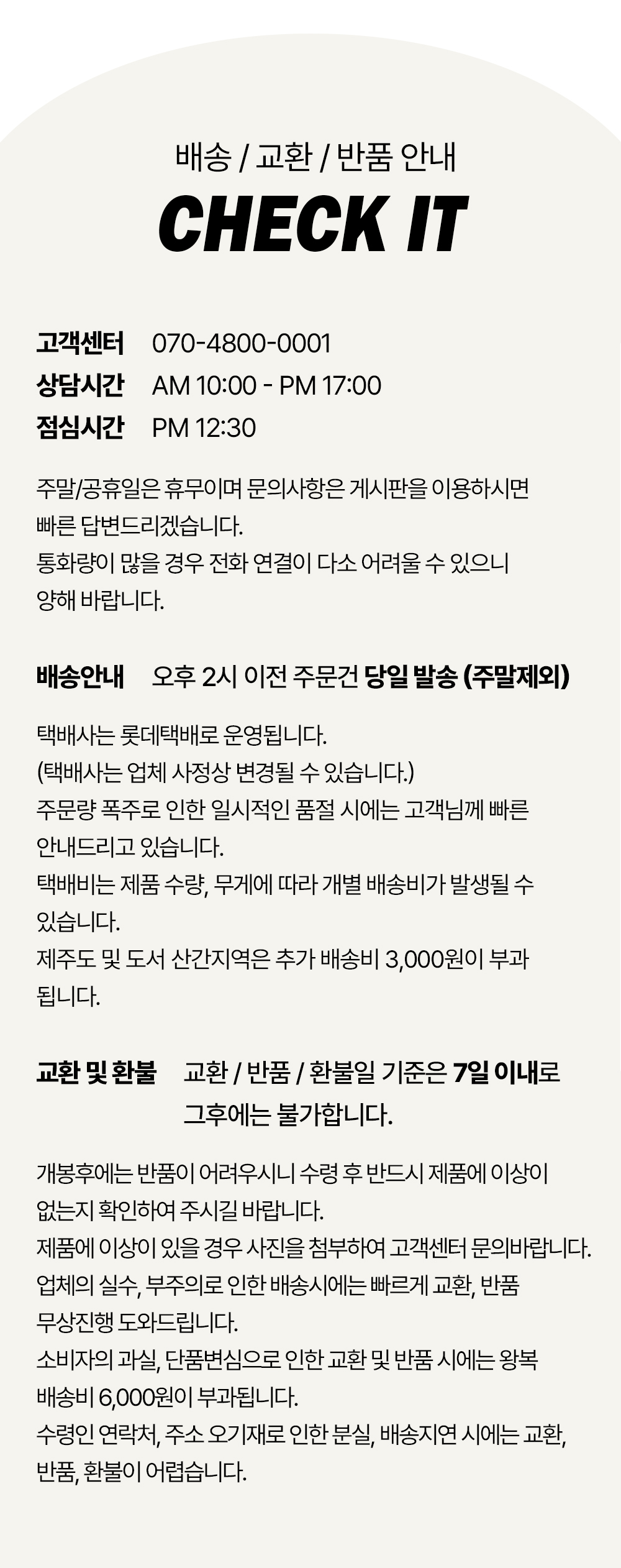 상품상세설명에 배송/교환/반품/취소 관련 안내가 기재된 경우 다음 안내사항보다 우선 적용됩니다.