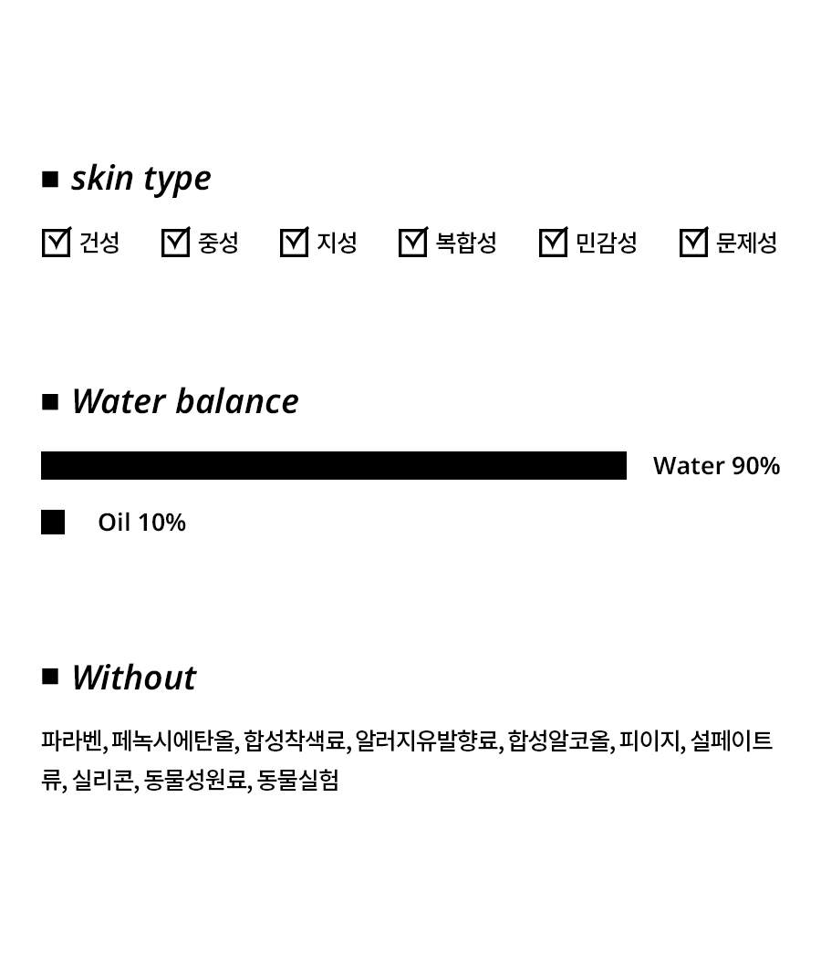- 정제수,프로판다이올,카프릴릭/카프릭트라이글리세라이드,다이프로필렌글라이콜,아이소프로필미리스테이트,아라키딜알코올,부틸렌글라이콜,자일리톨,베헤닐알코올,세테아릴알코올,호호바씨오일,잇꽃씨오일,아라키딜글루코사이드,카보머,알지닌,향료,세테아릴올리베이트,펜틸렌글라이콜,티트리잎추출물,솔비탄올리베이트,1,2-헥산다이올,카프릴하이드록사믹애씨드,티트리잎오일,카프릴릴글라이콜,베타인살리실레이트,효모발효물,삼나무잎추출물,연꽃잎추출물,리모넨,포도추출물,오렌지추출물,사과추출물,레몬추출물,라임추출물,유칼립투스잎추출물,보리지추출물,옐로우체이스트위드추출물,레이디스맨틀추출물,서양톱풀추출물