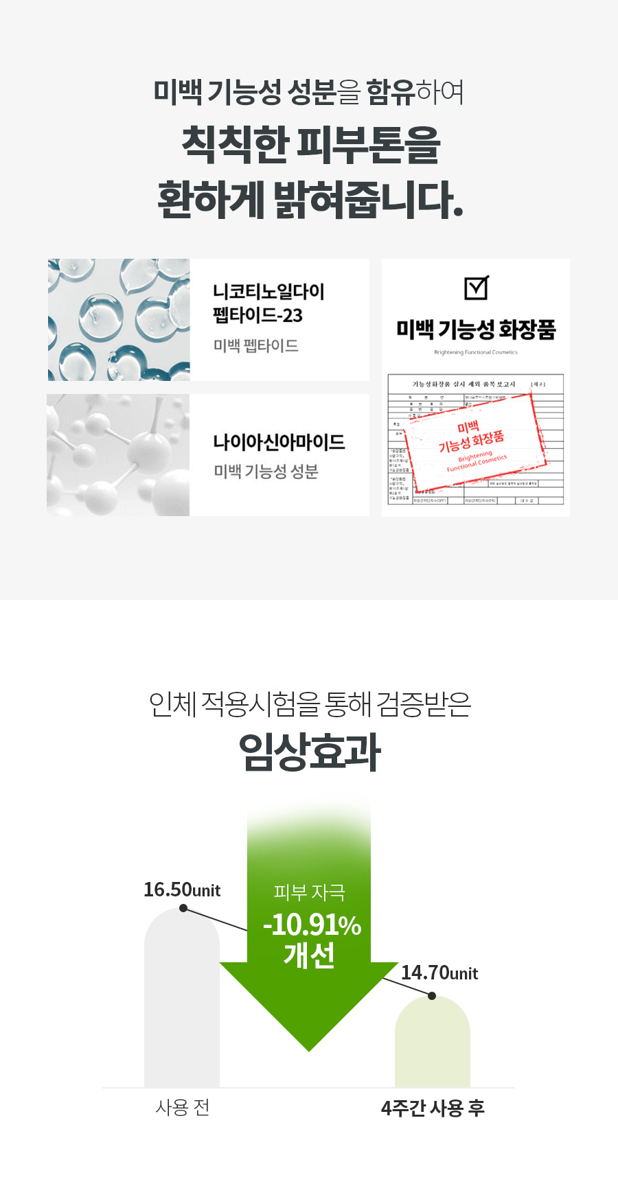 - 병풀추출물,글리세린,정제수,나이아신아마이드,으름덩굴추출물,니코티노일다이펩타이드-23,글라이코사미노글리칸,블랙윌로우나무껍질추출물,아미노부티릭애씨드,알란토인,1,2-헥산다이올,암모늄아크릴로일다이메틸타우레이트/브이피코폴리머,부틸렌글라이콜,펜틸렌글라이콜,카프릴릴글라이콜,하이드록시에틸아크릴레이트/소듐아크릴로일다이메틸타우레이트코폴리머,솔비탄아이소스테아레이트,카프릴릴/카프릴글루코사이드
