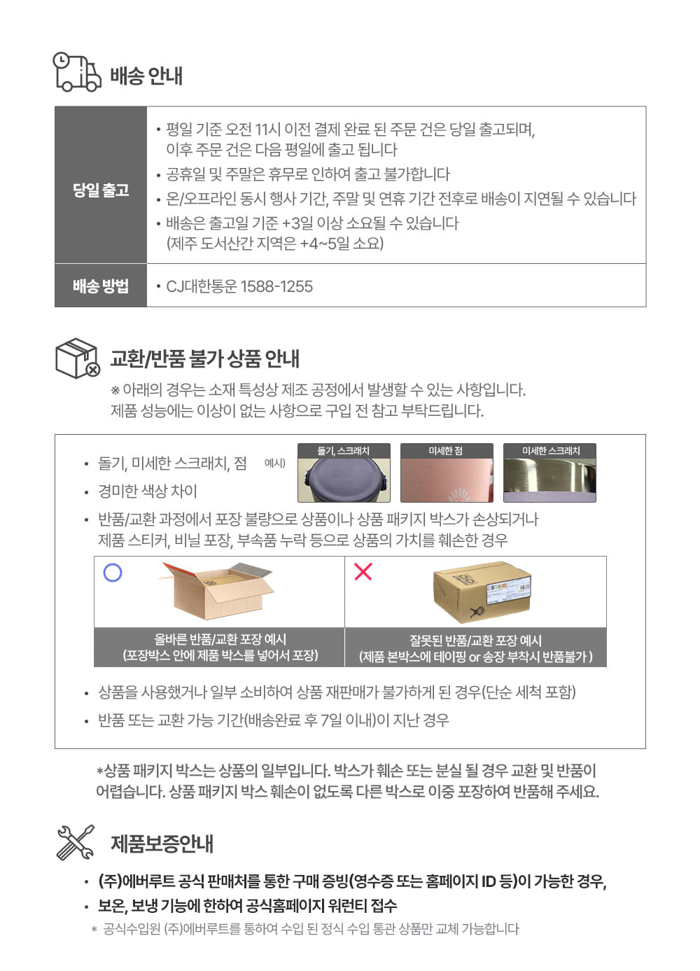 - 주문제작 상품 및 상품의 본품박스, 택 등이 제거되어 있을 경우 반품 / 교환이 불가능합니다.