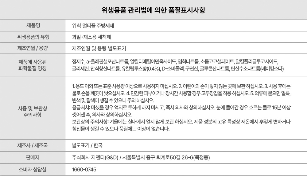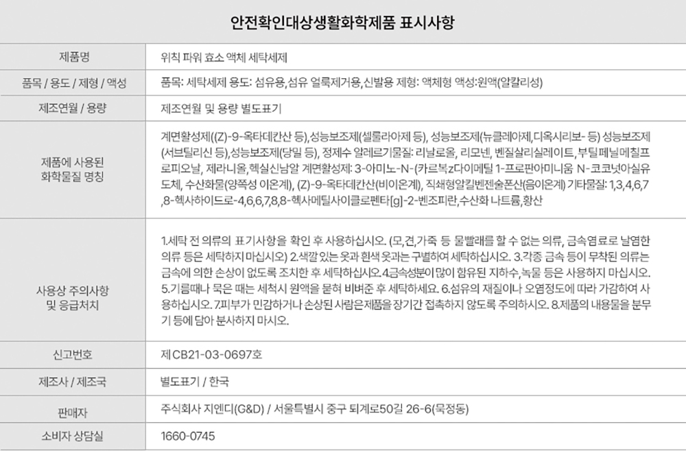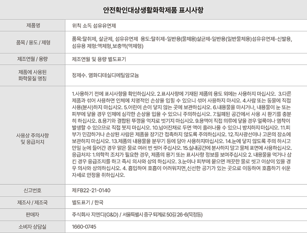 - 용도(표백제의 경우 계열을 함께 표시) 및 제형