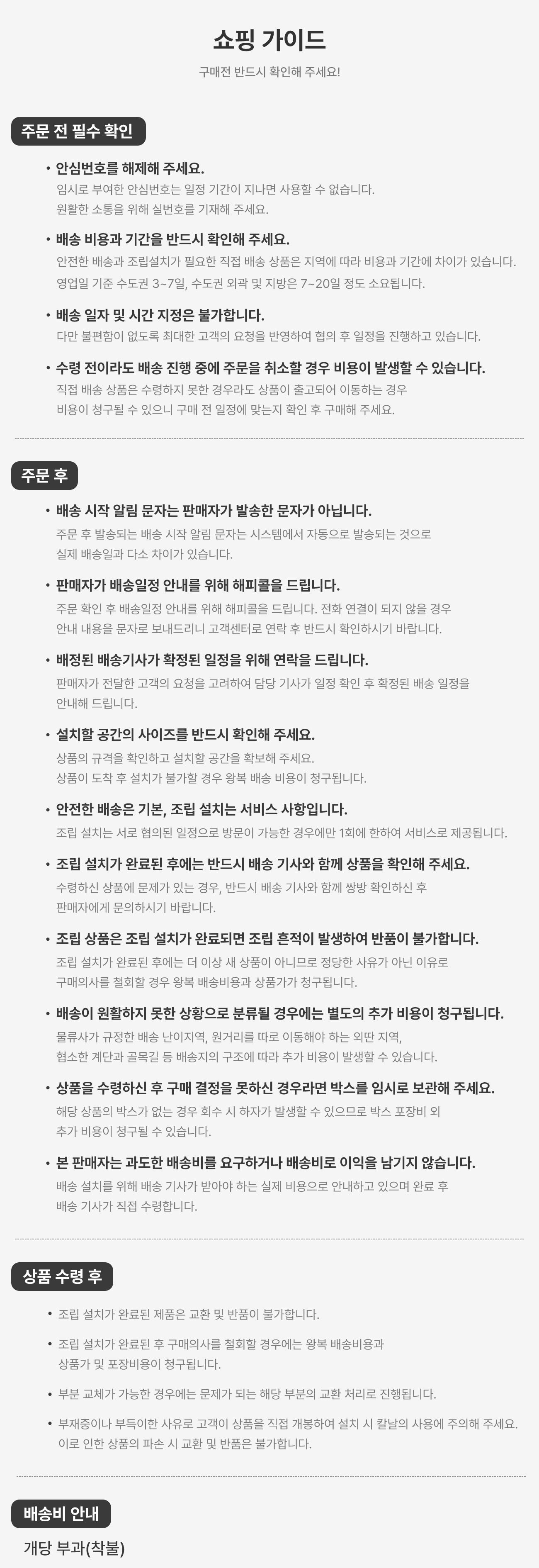 상품상세설명에 배송/교환/반품/취소 관련 안내가 기재된 경우 다음 안내사항보다 우선 적용됩니다.