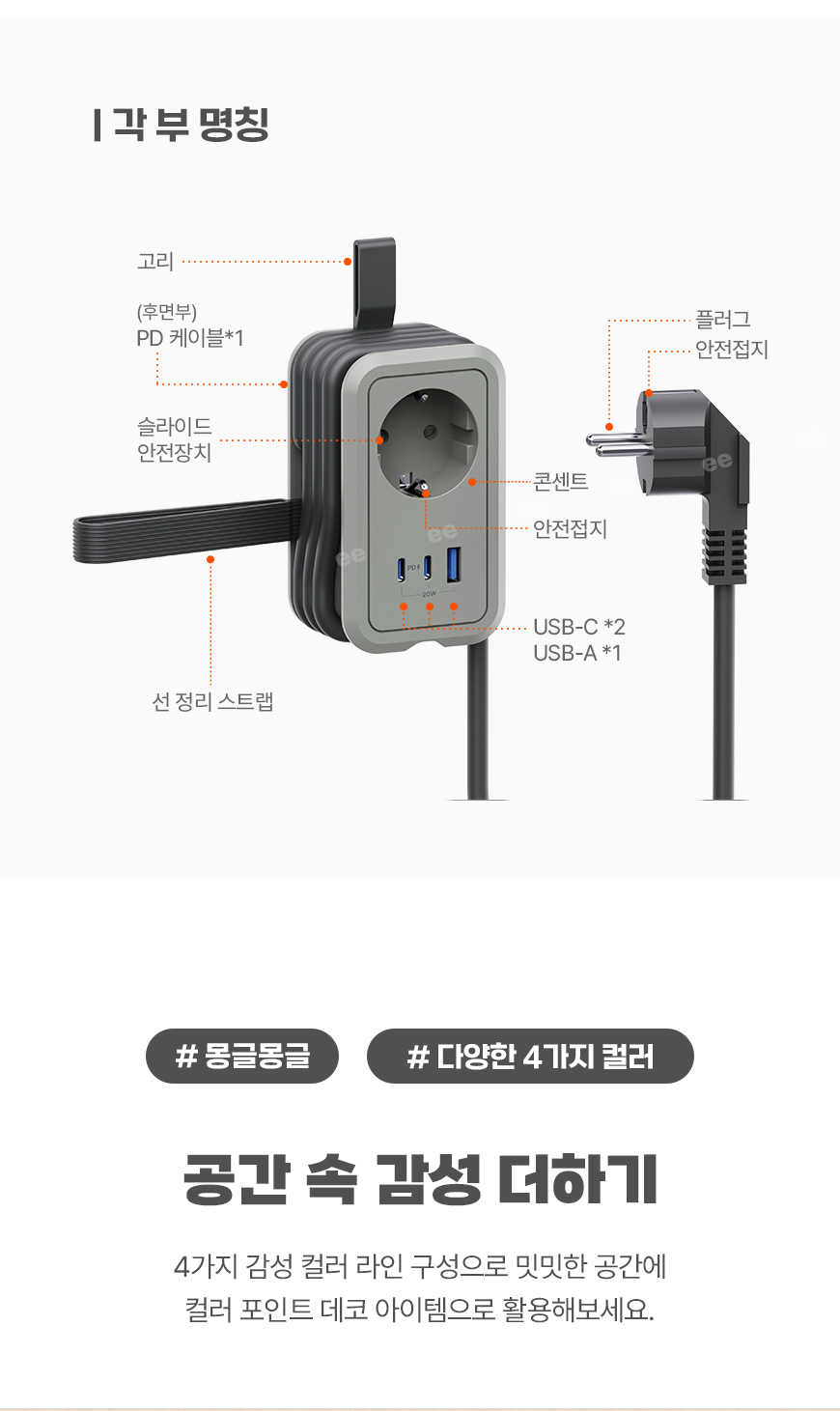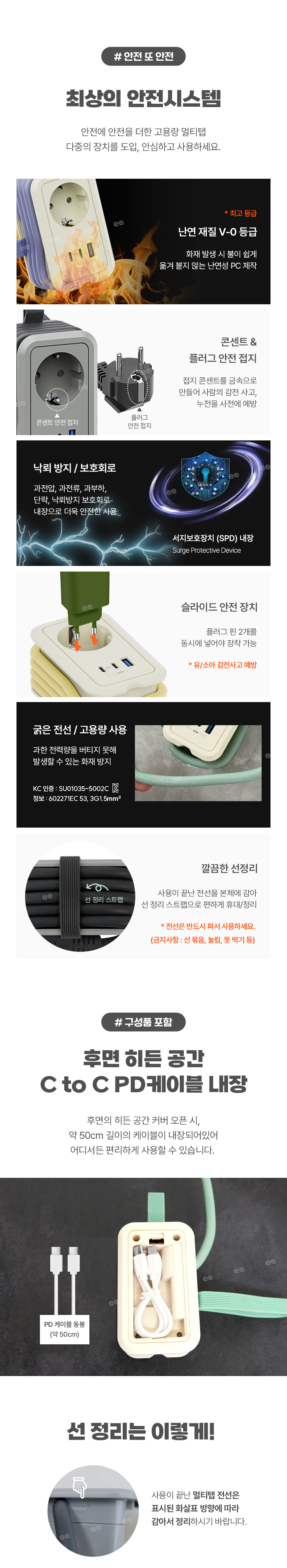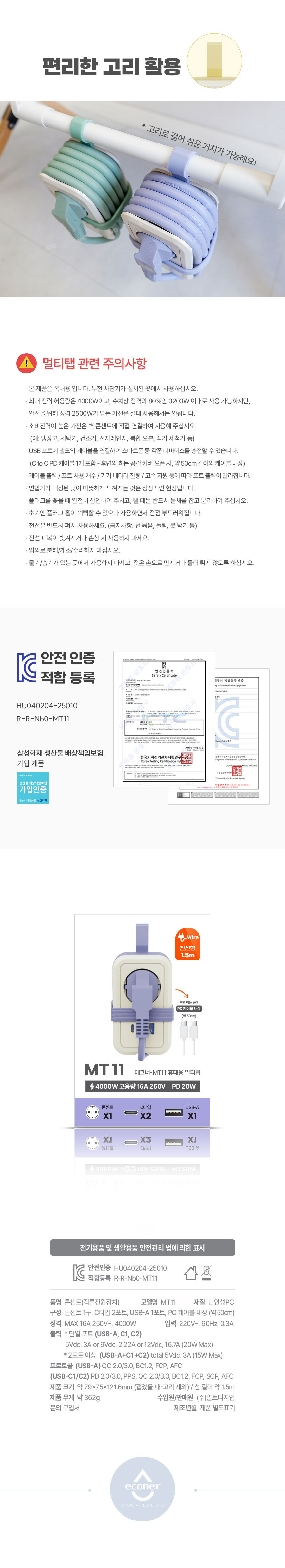 휴대용 충전기 멀티탭 전선형 1.5m (C to c 케이블 내장)