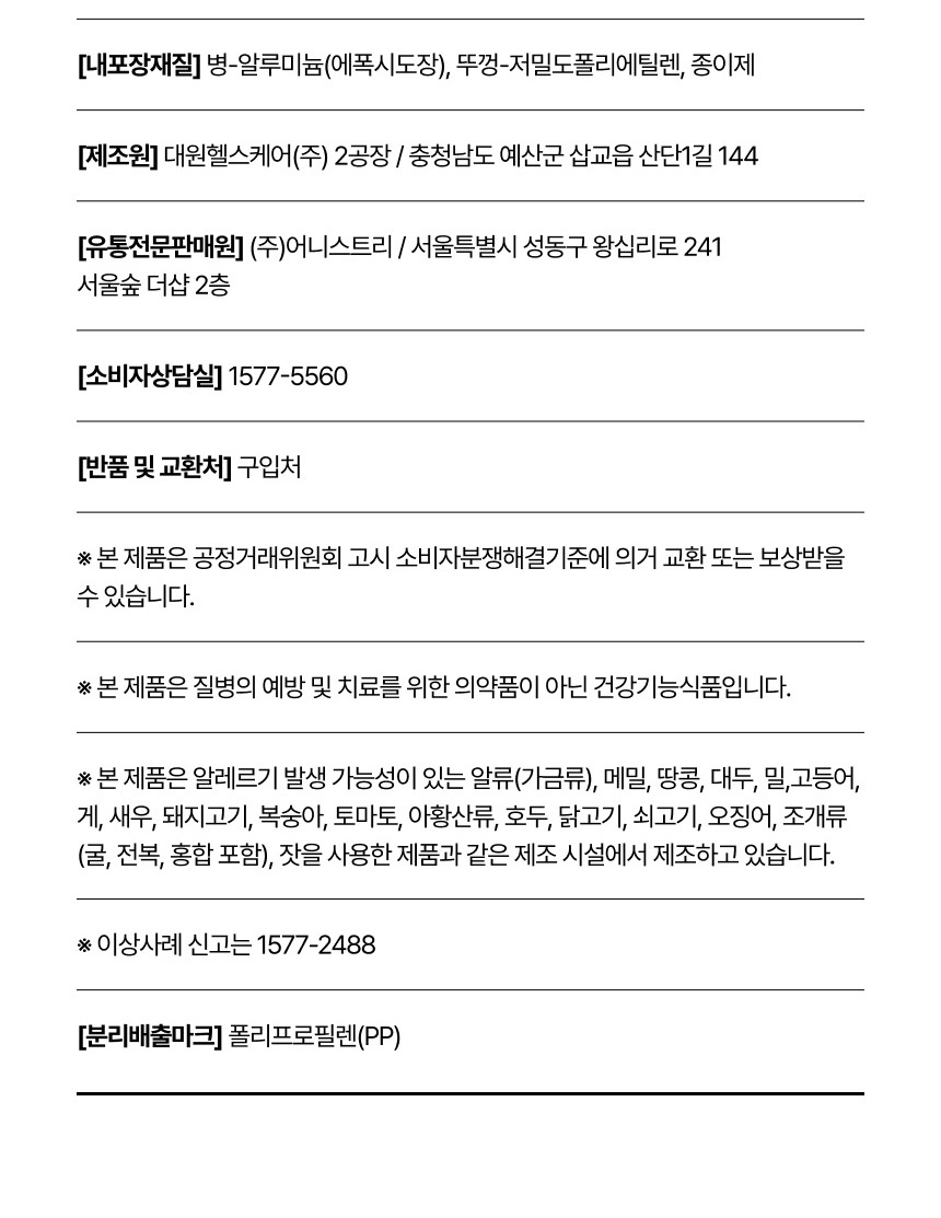 • 원료명 및 함량 (「농수산물의 원산지 표시 등에 관한 법률」에 따른 원산지 표시 포함)