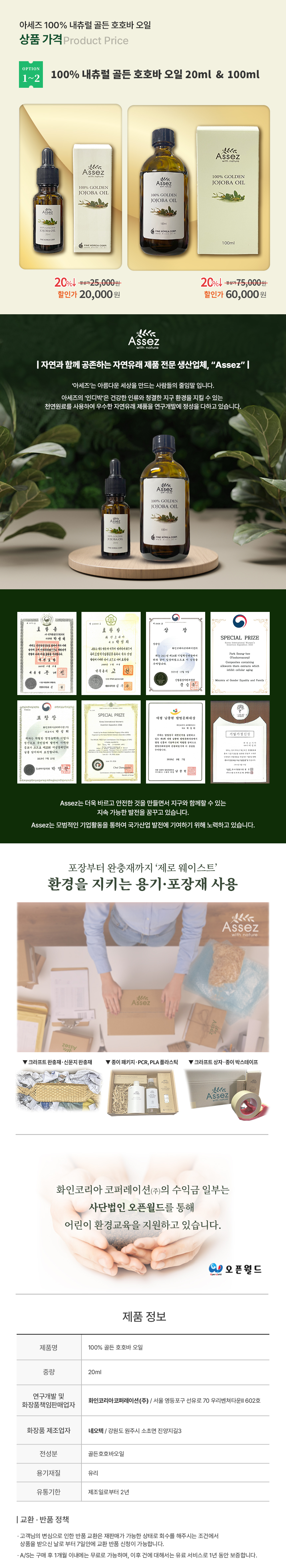[하이서울기업][아세즈]100% 내추럴 골든 호호바 오일 100ml
