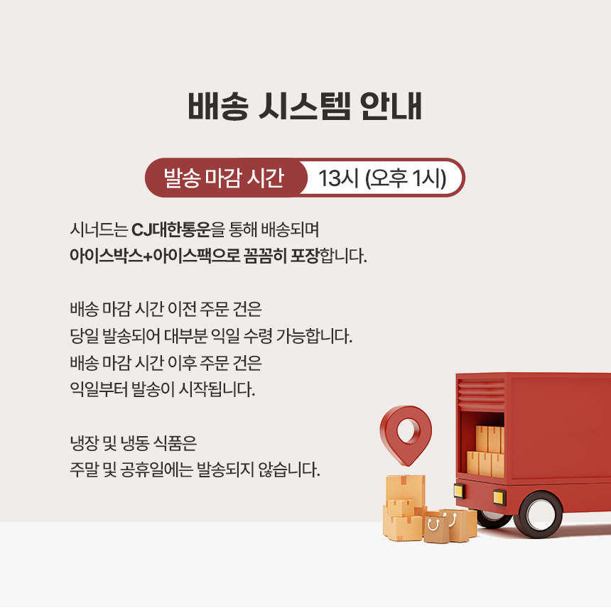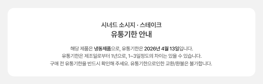 - 신선식품의 경우 재판매가 불가능한 제품 특성상 단순변심 및 개인적 입맛 차이로 인한 반품은 불가능하며 제품 수령 후 문제가 있는 경우 이상부분 사진 촬영하여 수령하신 날짜 기준 2일 이내 연락해주셔야합니다.(기일은 업체별 상이할 수 있으니 수령즉시 연락 부탁드리겠습니다.)