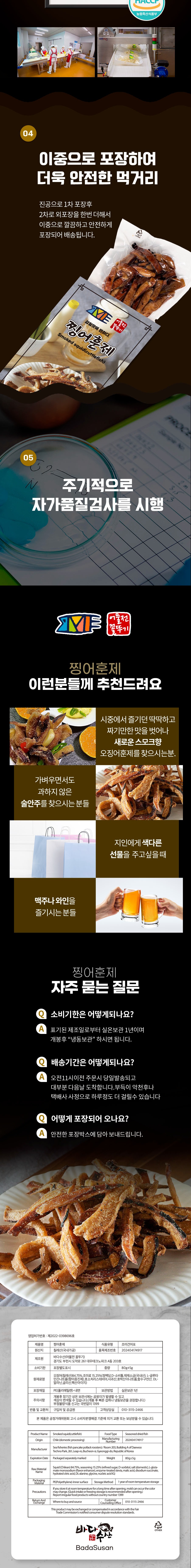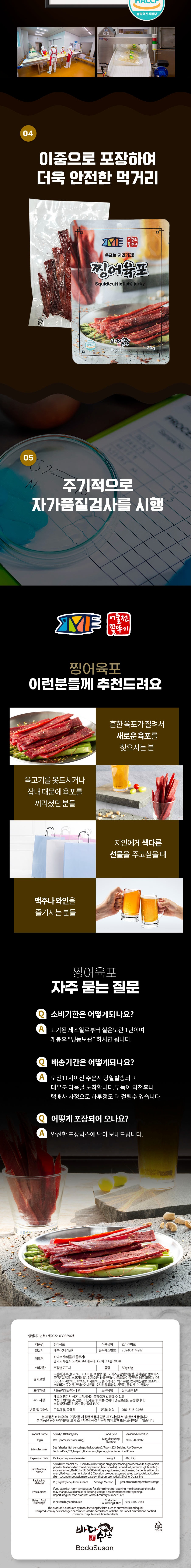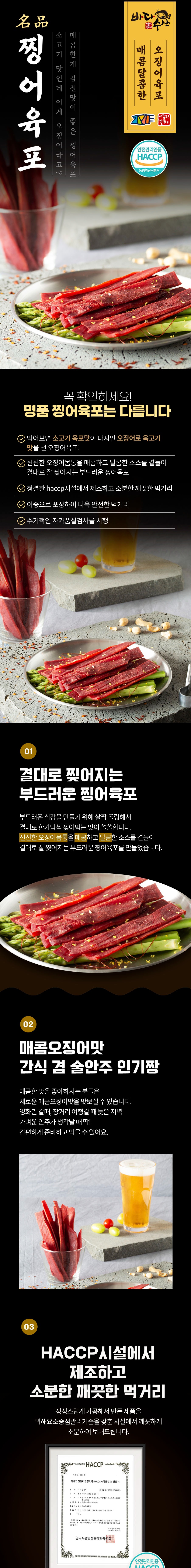 오징어 몸통에 매콤한 소스를 더해 육포처럼 만든 제품으로, 씹을수록 매콤한 맛과 함께 육고기 같은 풍미를 느낄 수 있습니다. 하지만 질기지 않고 잡내 없이 깔끔한 오징어 특유의 식감이 살아 있습니다.