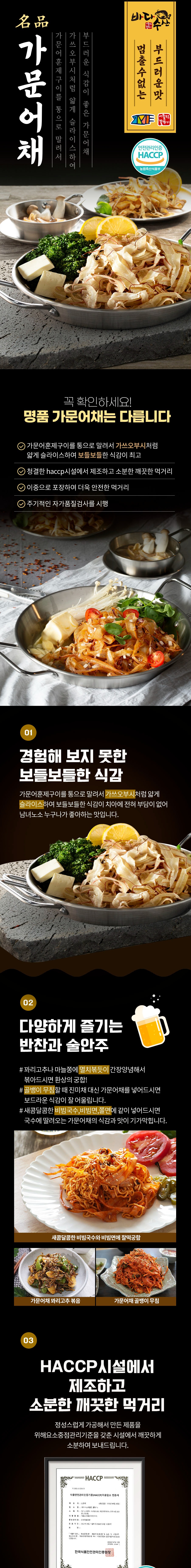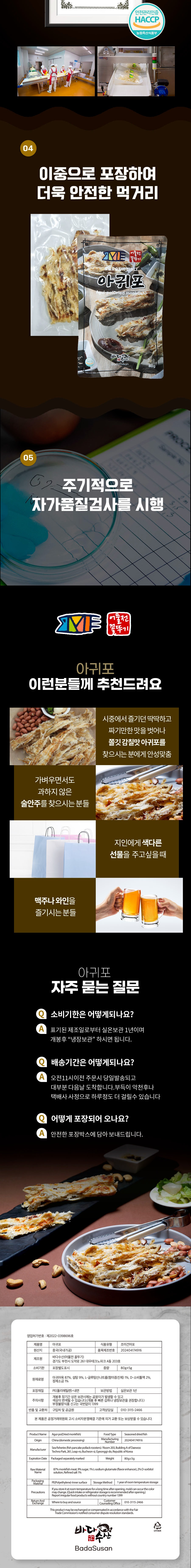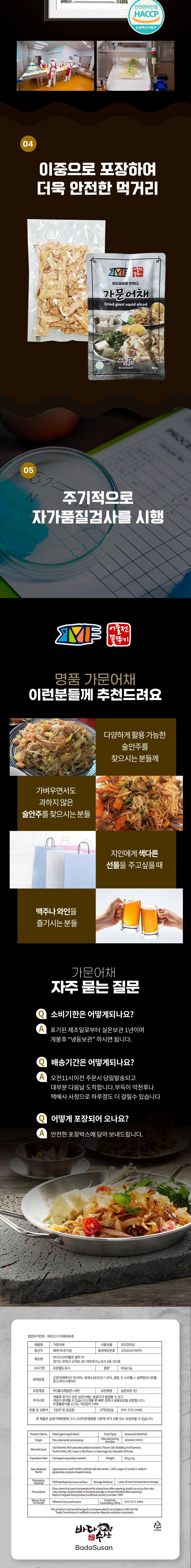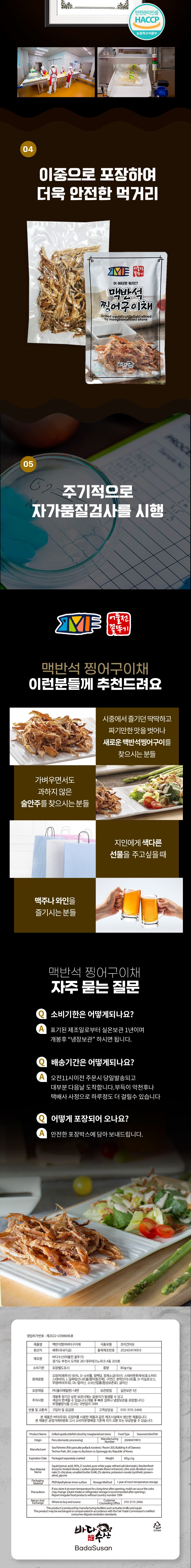 오징어 몸통에 매콤한 소스를 더해 육포처럼 만든 제품으로, 씹을수록 매콤한 맛과 함께 육고기 같은 풍미를 느낄 수 있습니다. 하지만 질기지 않고 잡내 없이 깔끔한 오징어 특유의 식감이 살아 있습니다.