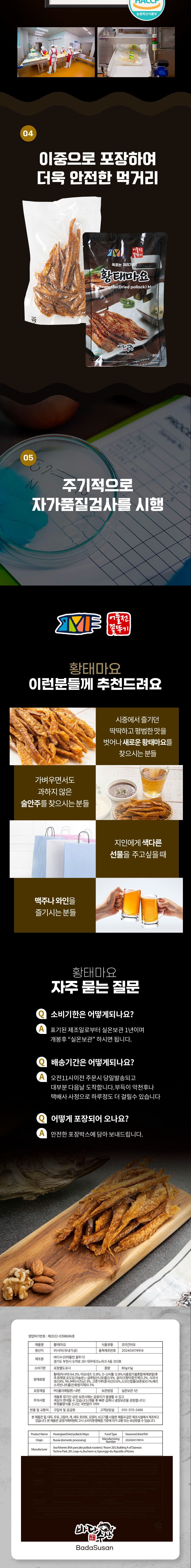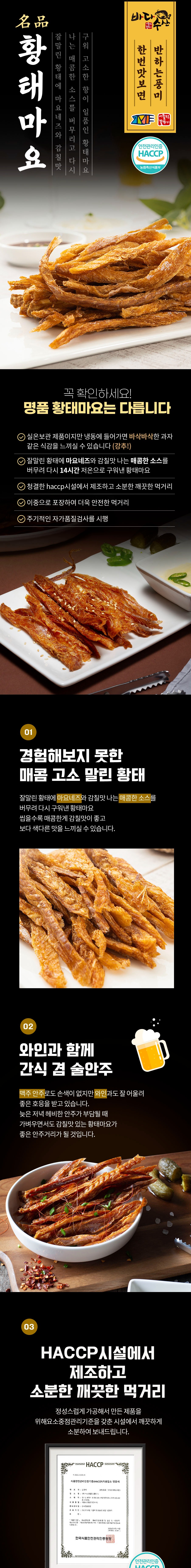 잘 말린 황태에 마요네즈와 매콤한 소스를 버무려 저온 건조한 제품입니다. 씹을수록 매콤한 풍미가 살아나 기존 황태의 밋밋함을 넘어선 새로운 맛을 제공합니다.