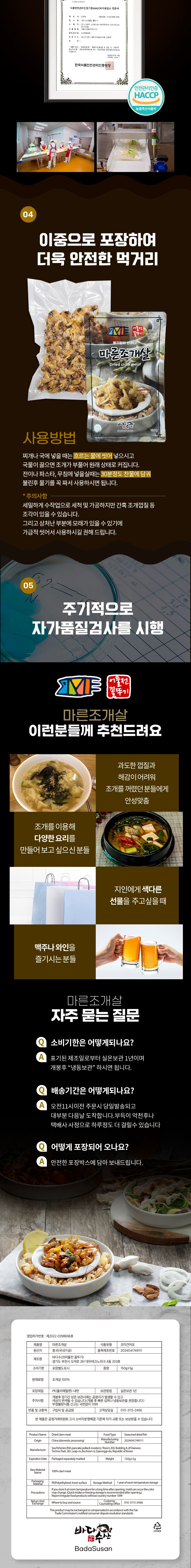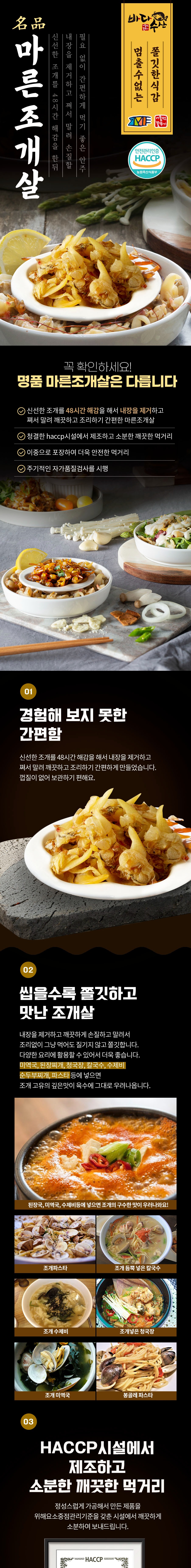 해감 및 내장 제거 후 잘 말린 개량조개살로, 피데기 오징어처럼 쫄깃한 식감이 일품입니다. 고급 안주용은 물론, 국물 요리나 파스타·전 등에 활용하기 좋습니다.