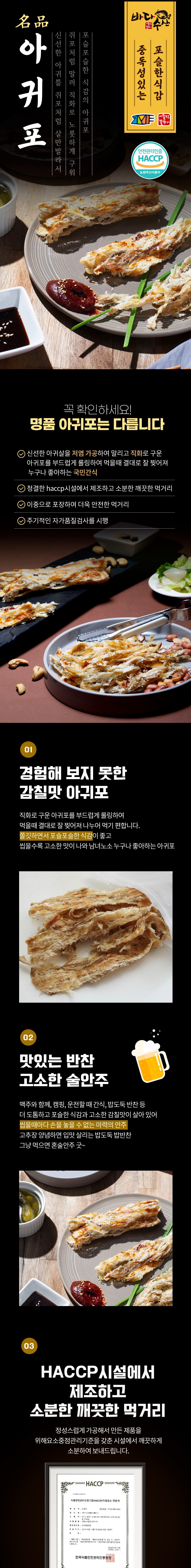 아귀 살만을 골라 쥐포처럼 가공한 뒤 롤링하여 부드럽게 만든 제품입니다. 포슬포슬하고 담백한 맛으로 호불호 없이 사랑받는 마른안주입니다.