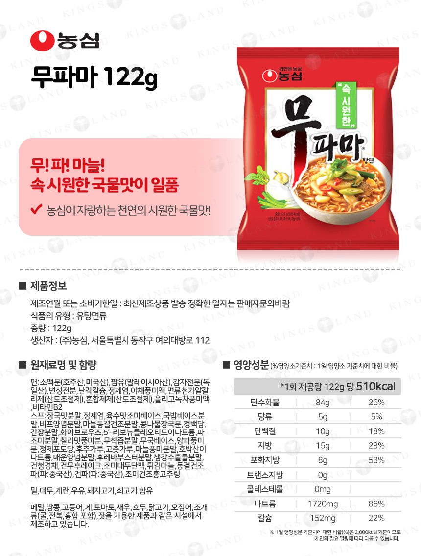 • 원재료명 (「농수산물의 원산지 표시 등에 관한 법률」에 따른 원산지 표시 포함) 및 함량(원재료 함량 표시대상 식품에 한함)