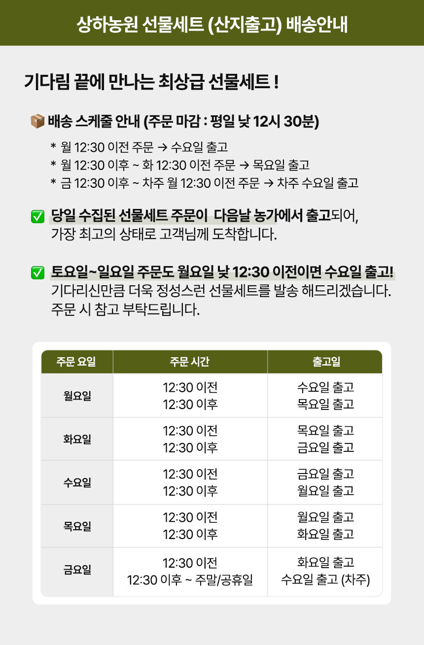 • 신선식품의 경우 재판매가 불가능한 제품 특성상 단순변심 및 개인적 입맛 차이로 인한 반품은 불가능하며 제품 수령 후 문제가 있는 경우 이상부분 사진 촬영하여 수령하신 날짜 기준 2일 이내 연락해주셔야합니다.(기일은 업체별 상이할 수 있으니 수령즉시 연락 부탁드리겠습니다.)