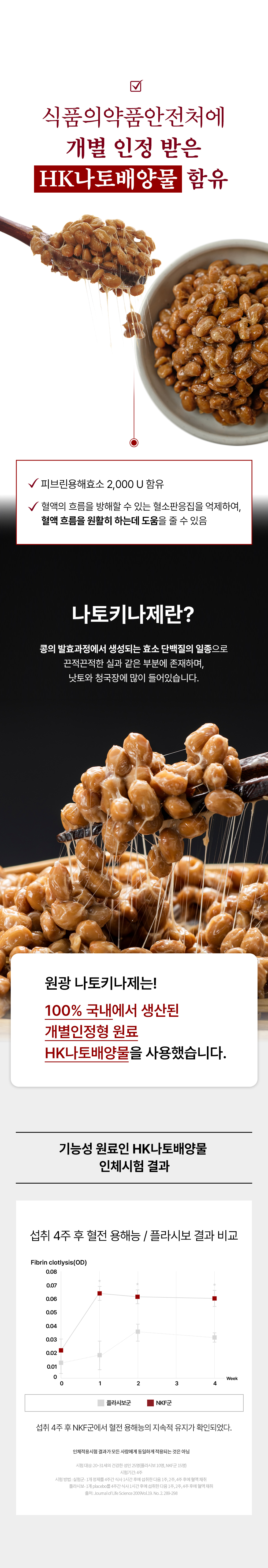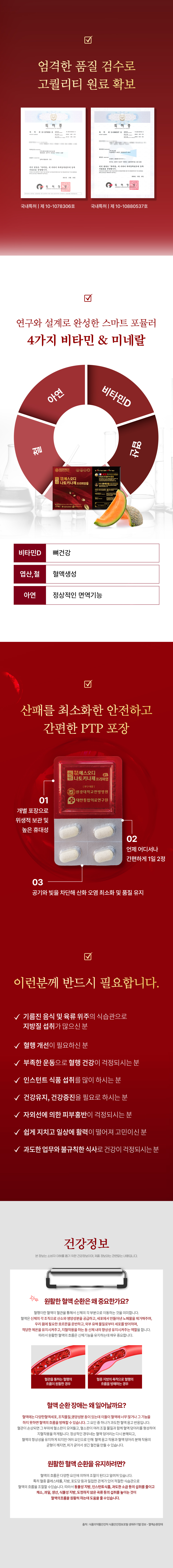 - 1일 섭취량 : 4정(2,400mg) 열량 8kcal 탄수화물2g(1%), 단백질 0g. 지방0g, 나트륨 0mg, SOD활성 500 IU, 피브린용해효소활성 2,000U, 비타민D 5㎍. 엽산 425㎍ DFE, 철 3.6 mg, 아연 2.55mg ※ %영양성분기준치 : 1일 영양성분기준치에 대한 비율