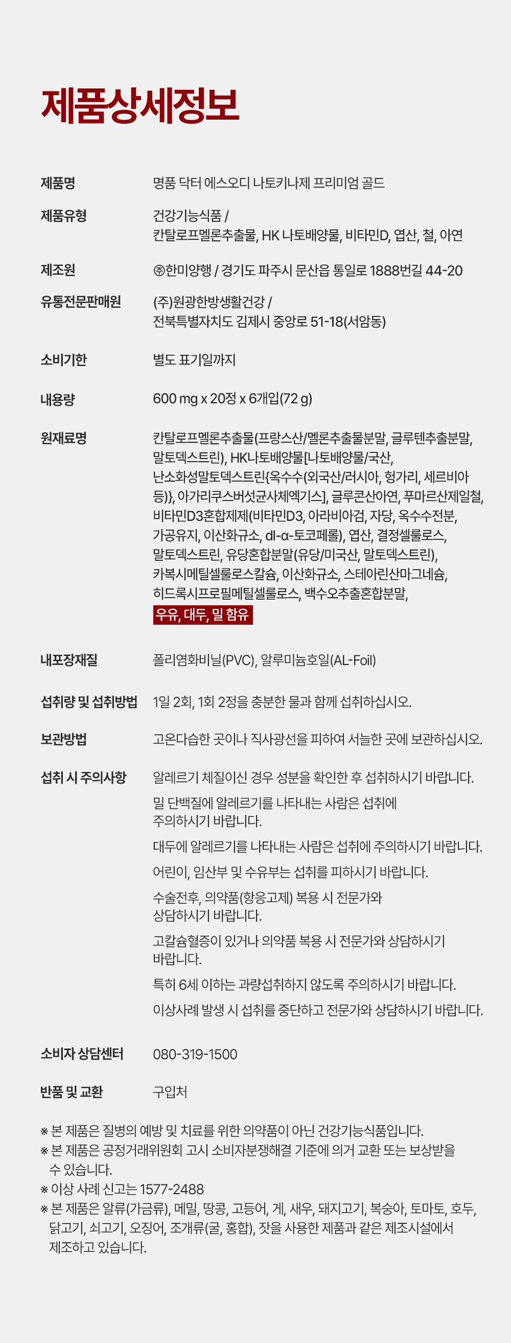 - 칸탈로프멜론추출물(프랑스산/멜론추출물분말,글루텐추출분말,말토덱스트린),HK나토배양물(국산)(나토배양물,난소화성말토덱스트린(옥수수(외국산/러시아,헝가리,세르비아 등),아가리쿠스버섯균사체엑기스),글루콘산아연,푸마르산제일철,비타민D3혼합제제(dl-알파-토코페롤),엽산,결정셀룰로스,말토덱스트린,유당혼합분말(유당/미국산,말토덱스트린),카복시메틸셀룰로스칼슘,이산화규소,스테아린산마그네슘,히드록시프로필메틸셀룰로스,백수오추출혼합분말,우유,대두,밀 함유